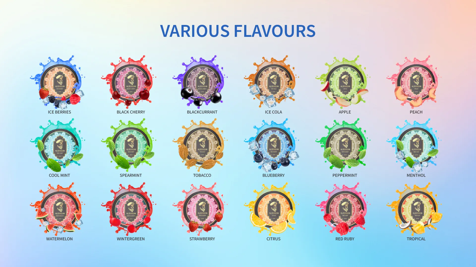 Blueberry | Citrus | Ice Cola | Menthol | Peach | Red Ruby | Blackcurrant | Strawberry | Wintergreen | Spearmint | Peppermint